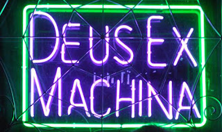La frase trae origine dal teatro greco: in tale ambito, quando era necessario far intervenire un dio (o più dèi) sulla scena, l’attore che interpretava il dio si posizionava su una rudimentale gru in legno, mossa da un sistema di funi e argani, chiamata appunto mechanè. In questo modo, l’attore veniva fatto scendere dall’alto, simulando dunque l’intervento di un dio che scende dal cielo; difatti, l’espressione deus ex machina significa proprio “dio (che viene) da una macchina”. L’intervento ex machina degli dèi veniva spesso usato, soprattutto dal tragediografo Euripide, per risolvere una situazione intricata e apparentemente senza possibile via di uscita.